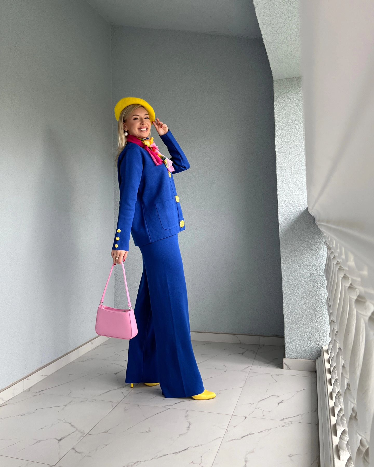 Affichez un luxe discret avec cet ensemble cardigan et pantalon en tricot, conçu pour allier raffinement et bien-être. Son design sophistiqué, agrémenté de boutons dorés et de poches plaquées, apporte une touche chic et intemporelle à votre garde-robe.